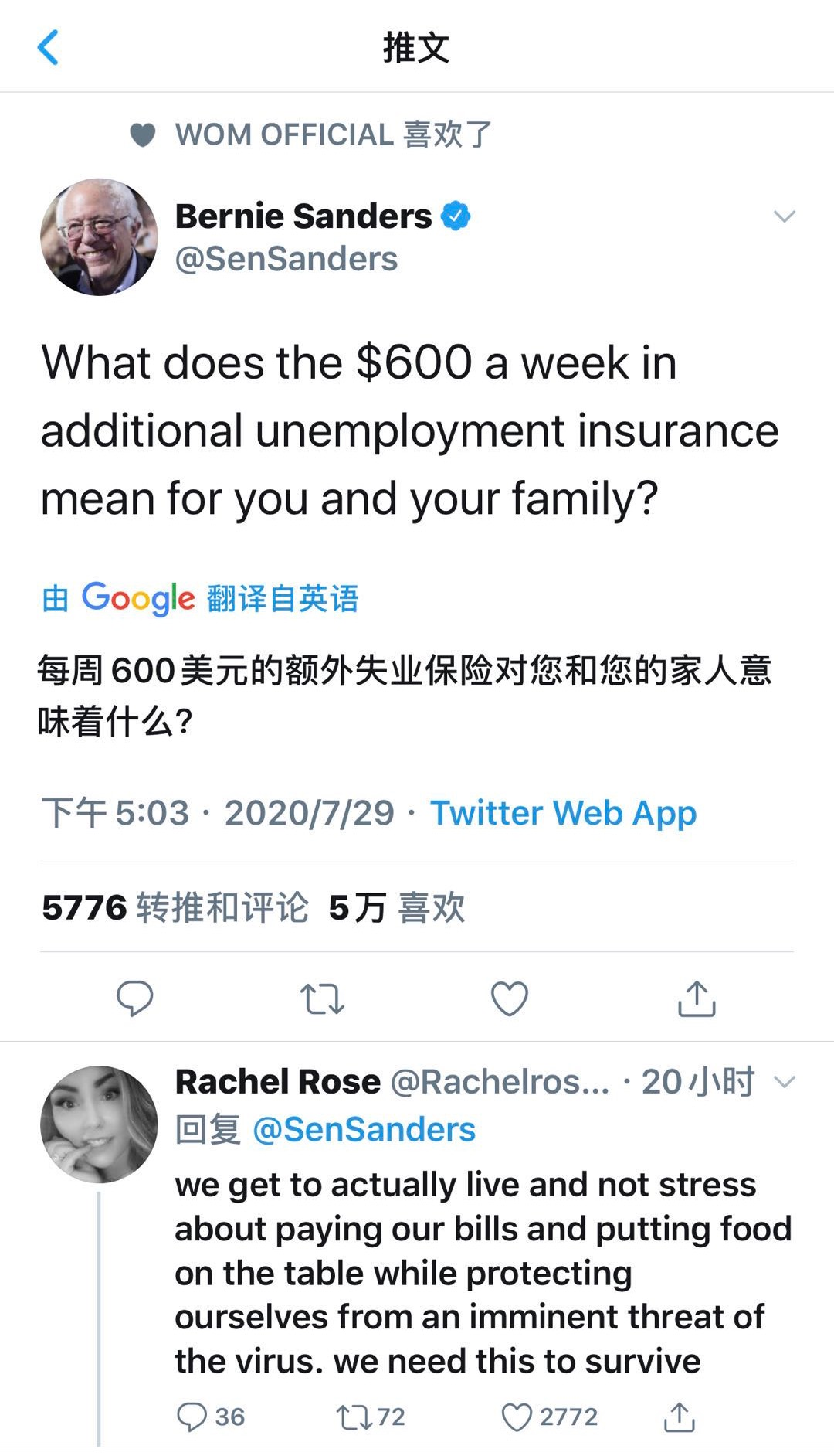 “每周600美元的额外失业保险,对您和您的家人意味着什么?”参与过今年总统竞选的美国佛蒙特州参议员伯尼·桑德斯,曾在上周的一条推特中如此写道。