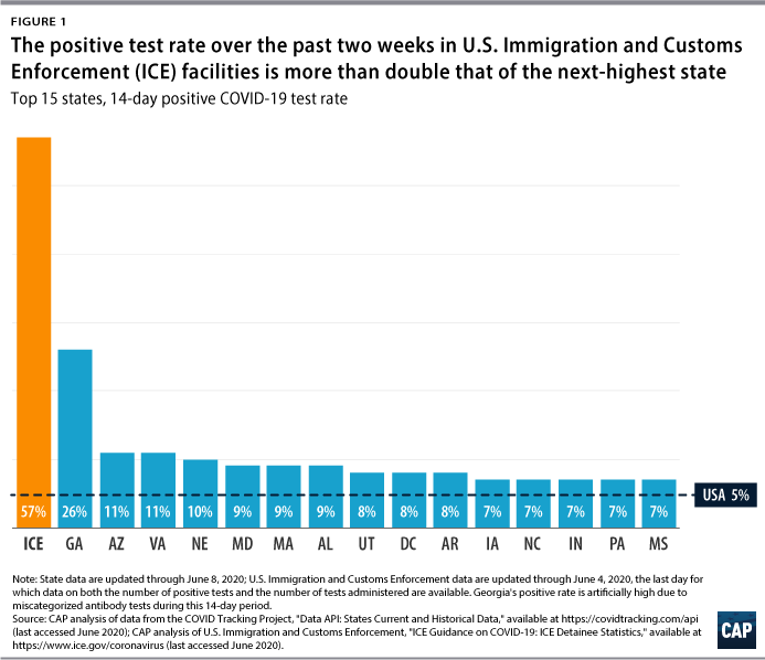 当疫情席卷美国时,ICE仍然在关押着约3.8万人;直到现在,仍然有2.2万人正在处于ICE的监管之中。在让美国社会受到前所未有重创的这场疫情之中,六月份阳性测试率最高的地方不是情况急速恶化的乔治亚或者亚利桑那,而是ICE的拘留营:一份政策机构“美国进步中心(Center for American Progress)”的报告显示,这些拘留营的新冠病毒5月和6月的测试阳性率高达57%。