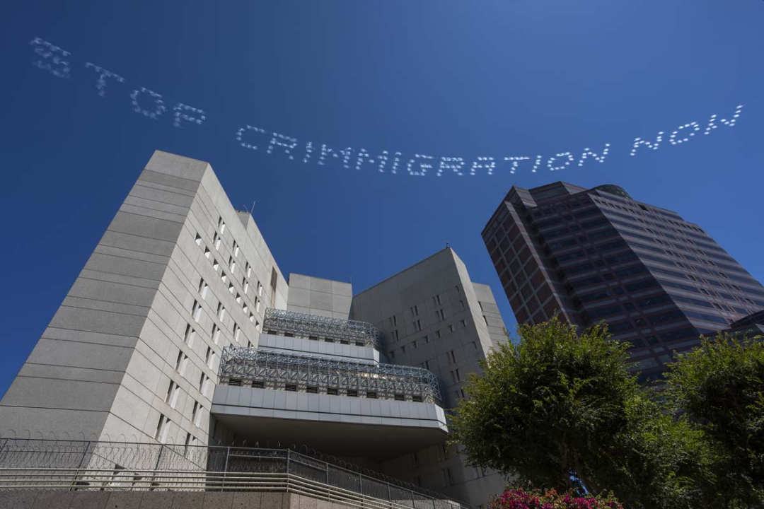 以墨西哥移民后裔拉法.埃斯佩扎(Rafa Esperza)和加拿大移民卡希尔斯(Cassils)领导的80余名艺术家用自己的行动做到了这一点。从7月3日开始,他们在精细的准备下于不同的时间段在洛杉矶各个景点和政府部门进行了盛大的“天空字”表演。这一举动获得了大量不同组织和机构的赞助,其中包括洛杉矶本地的知名大学东方学院(Occidental College)和民权机构“美国公民自由联盟(American Civil Liberties Union,通常简称ACLU)”。