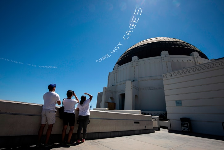 几乎每年的7月4日美国独立日,洛杉矶都是一片欢乐的海洋:在夜晚,人们会欣赏着绚烂漫天的烟火;而在白天,人们会看到艺术家创作“天空字”,用小型飞机和特殊烟雾在空中画出的文字和图案。