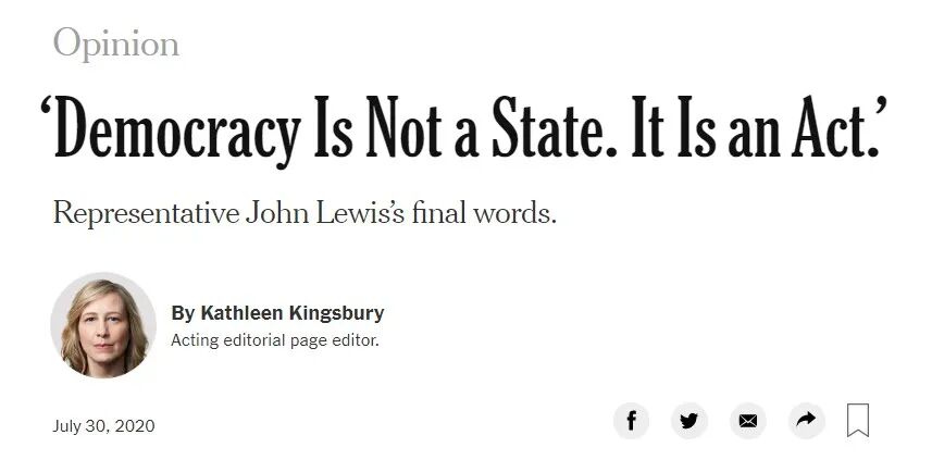 《纽约时报》编委会在纪念词中写道,刘易斯先生的道德权威“源于他和他的同胞在1960年代初参与的学生非暴力协调委员会中发起的具有侵略性但又自我牺牲的抗议活动,这是推翻南方种族隔离运动的一部分” 。