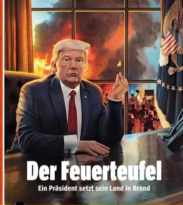 《明镜》周刊最近的封面描绘了特朗普在白宫椭圆形办公室里拿着一根点燃的火柴,透过他的窗户可以看到一个正在燃烧的国家。封面标题是“Der Feuerteufel”,字 面意思是“火魔”。