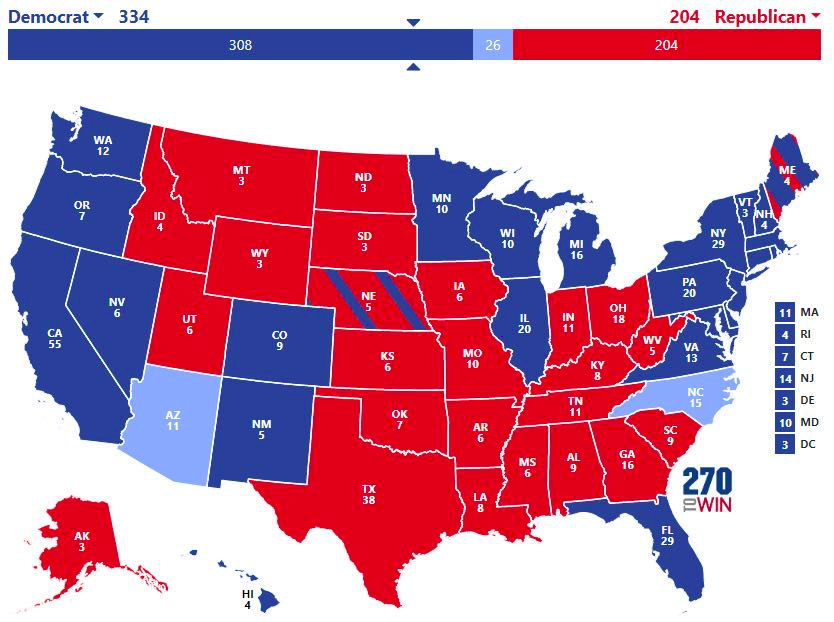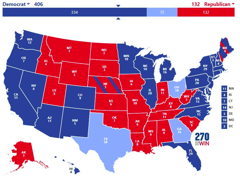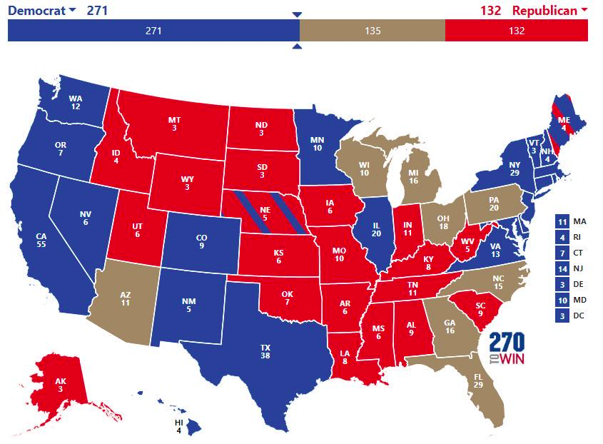 所谓“选举人团”是美国宪法规定的总统选举机制。每个州根据人口分配一定数量的选举人,人口最多的加州有55个选举人,而几个人口小州每个州就只有3个选举人。选举时在一个州获得最多票数的候选人得到该州所有选举人的票(所谓的“赢家通吃”)。最后得到选举人人数过半的候选人当选总统。比如2020年选举人团人数为538,得到至少270票的候选人将当选总统。
