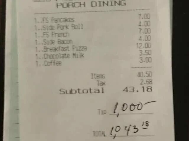 一天,一位从2001年就经常光顾这里的顾客来吃早餐,结帐的时候,他在43元的账单上,加了1000美元的小费。