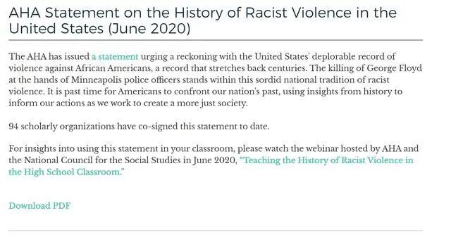 想要了解在课堂上使用这份声明,请观看2020年6月由AHA和全国社会研究理事会主办的网络研讨会,“在高中课堂上教授种族主义暴力史”。