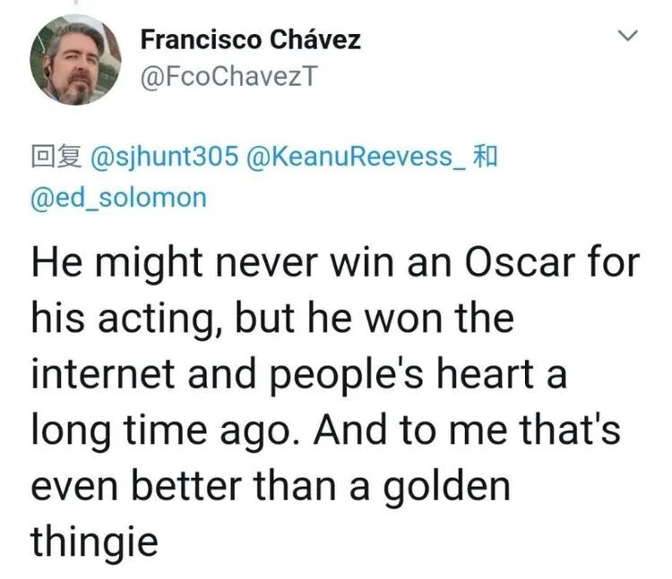 一个网友说的好:“里维斯也许没有因为演技获得过奥斯卡奖,但是他早已赢得网络和人们的心。在我看来,这比那个小金人更可贵。”