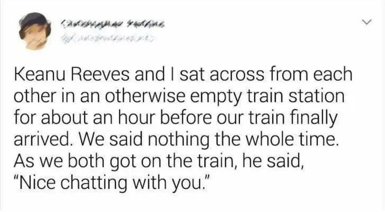 在众多基努·里维斯的故事中,我最喜欢的是这个。一位女士说她在空空荡荡的车站等火车的时候,里维斯坐在她的对面,两人一直没有说话。等到火车来了之后,里维斯对她点点头,说:“很高兴和你交谈”。