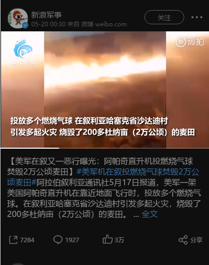 5 月 20 日前后,一则新闻曾在网络上广泛流传,内容是:美军使用阿帕奇直升飞机在叙利亚投掷燃烧气球,焚毁 2 万公顷麦田。