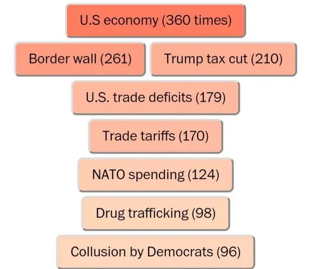 特朗普第二多的说法是他的墨西哥边境墙正在修建,说了共261次。美国国会拒绝为他设想的混凝土屏障提供资金,因此该项目演变成用钢柱围栏取代较小、较旧的屏障,只有三英里的屏障是新建的。