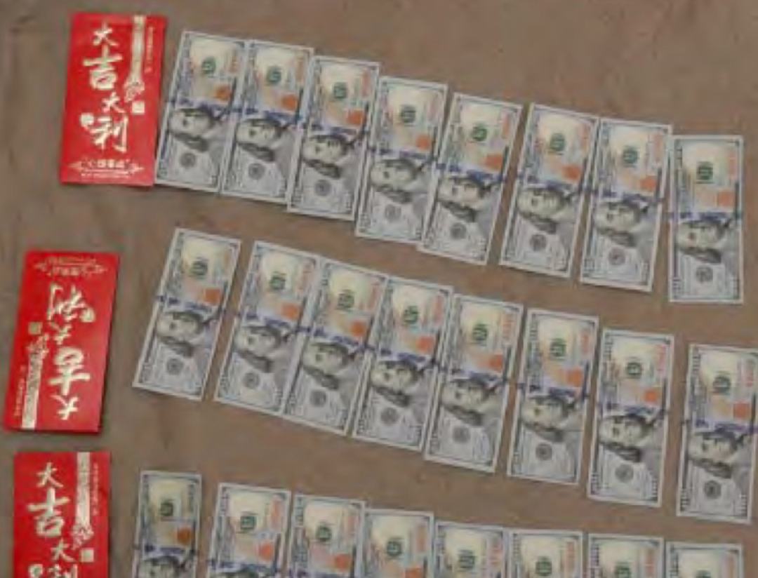在惠泽尔家搜到的这些红包,上面还写了几个中文大字,对于学过基础中文的执法者来说肯定不陌生: