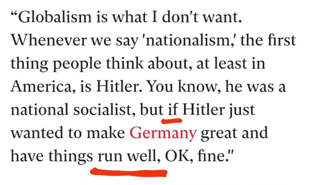 而Owens本人,有一次访谈中说,自己不反对民族主义,只反对全球化。希特勒是个民族社会主义者,如果他只是想让德国更为伟大,并且能做得很好,那就很不错。但是他要把这种经验向别处推广,要搞全球主义,这就不行了。她的这段谈话,引来了巨大的争议。如果希特勒只是为了本国强大,就可以用谎言控制国内言论,杀害了成千上万的犹太人么?她讲这段话的目的,明显是想套用川普make xx great的句式,趁机向川普示好。可是类比明显不当,让人们把川普和希特勒联系在一起,拍马屁拍到了马腿上。