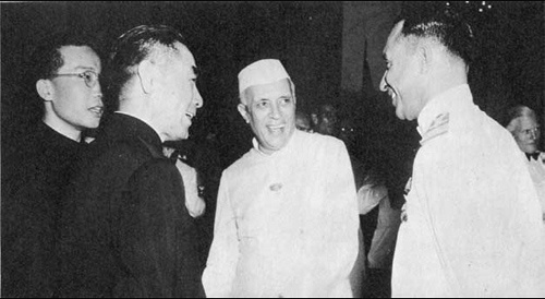 1954年6月,日内瓦休会期间,周恩来总理访问印度,与尼赫鲁(中)交谈。