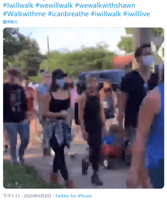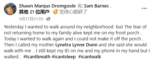 “昨天我想在我家附近散步, 但是,对不能活着回家的恐惧把我困在我家的前门廊。今天我又想散步了,我还是走不下门廊。然后我打电话给我的妈妈莱内特拉· 琳内·邓恩(Lynetra Lynne Dunn), 她说她会陪我散步。我还是得带着我的身份证,手里拿着手机,但是,我散步了。”