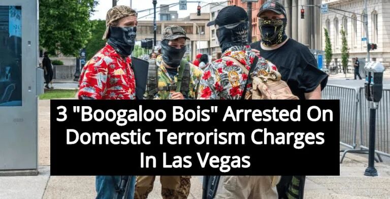 这篇文章援引美联社报道说,5月底,三名内华达州男子(下图)“在最近拉斯维加斯的抗议活动中,他们因与恐怖主义有关的指控而被捕,并阴谋引发暴力。”根据美联社获得的一份刑事起诉书副本,联邦检察官说,这些人携带了燃烧瓶,前往市中心。