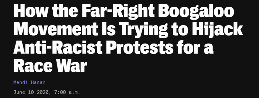 曾经发布斯诺登泄露文件,因揭露杜邦公司特氟龙污染毒害公众及工人等报道多次获新闻大奖的监听网站(The Intercept)也发表文章警告,美国国内存在恐怖威胁,美国极右组织“布加卢运动”试图劫持反种族主义抗议运动以发动种族战争。