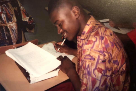 (弗洛伊德在休斯敦杰克耶茨高中的教室里。他是学校著名的足球和篮球运动员。)