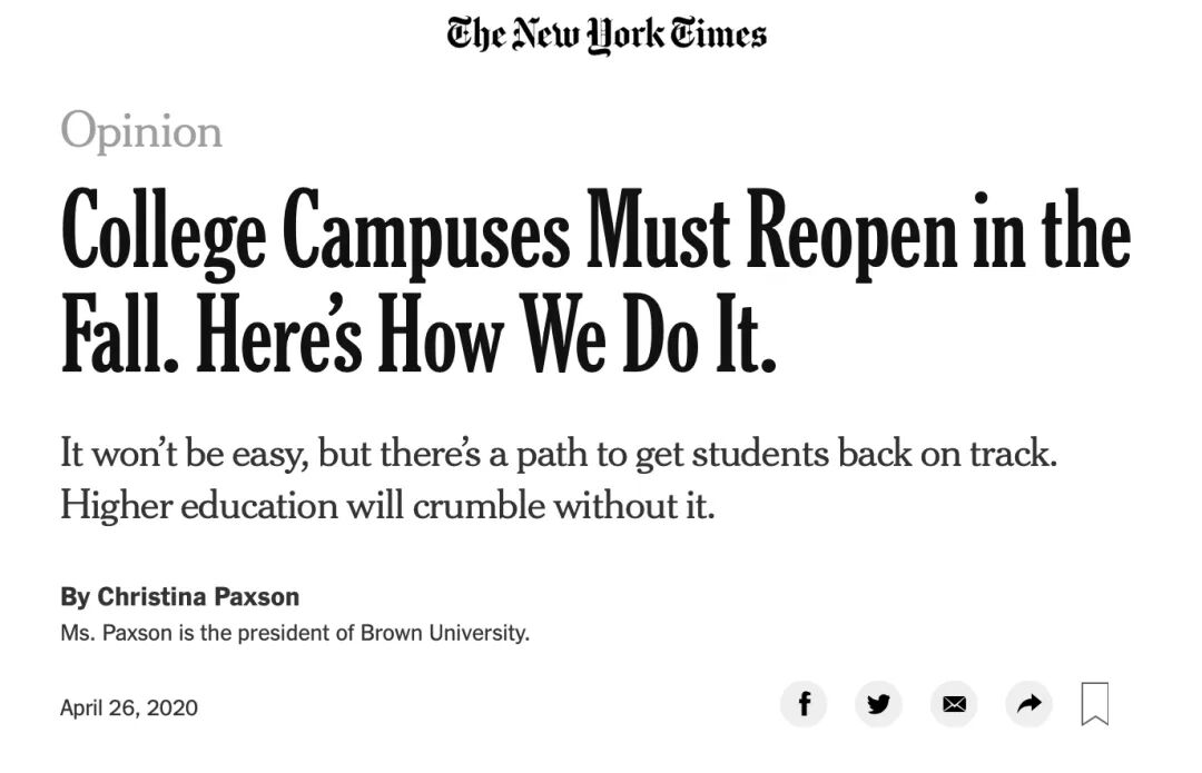 起初,一些学校和主流媒体因疫情事态严峻对开学表现出顾虑。直到4月底,布朗大学的校长Christina Paxson在纽约时报一篇文章中指出:如果大学若是想维持正常的运作就必须在秋季开学。