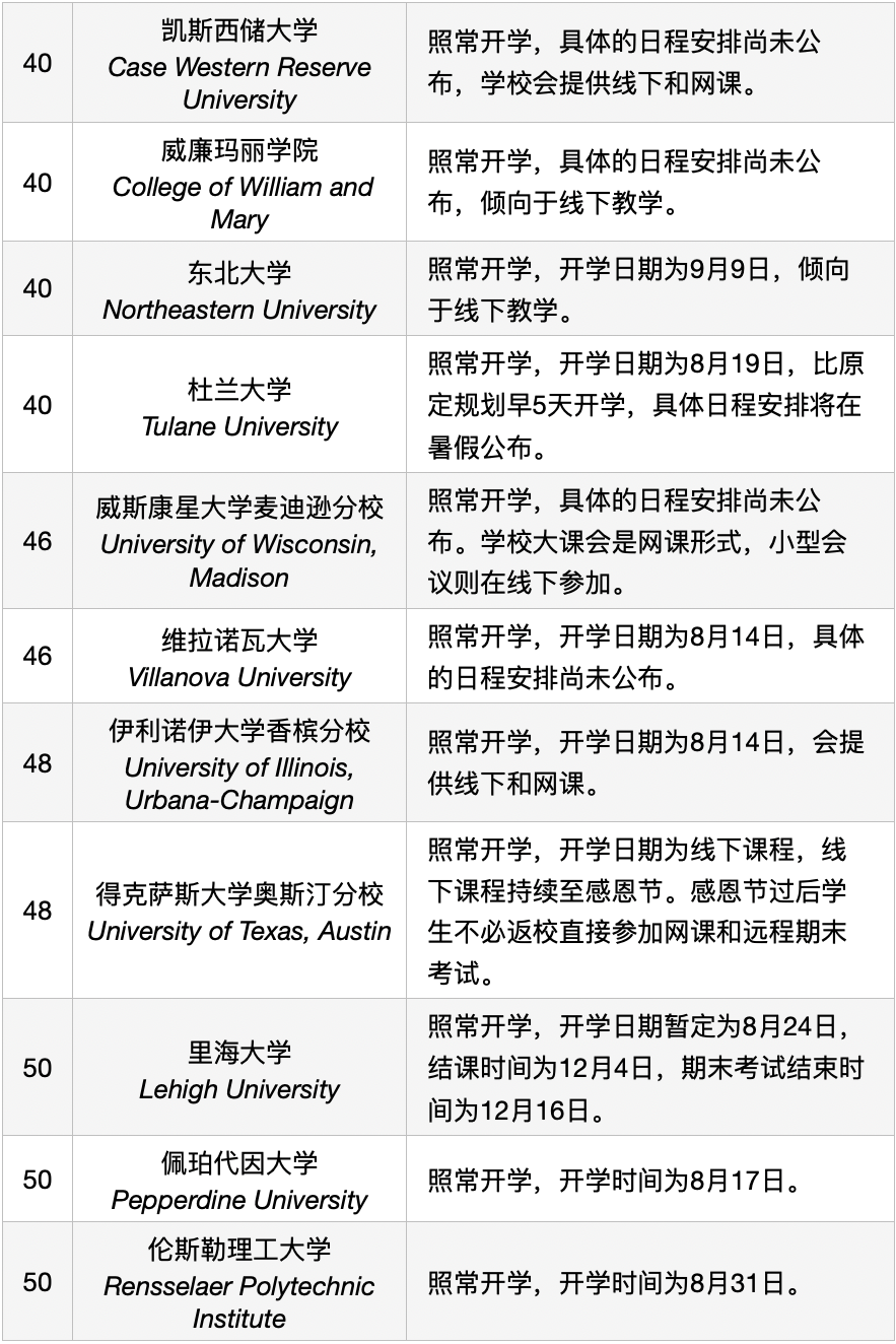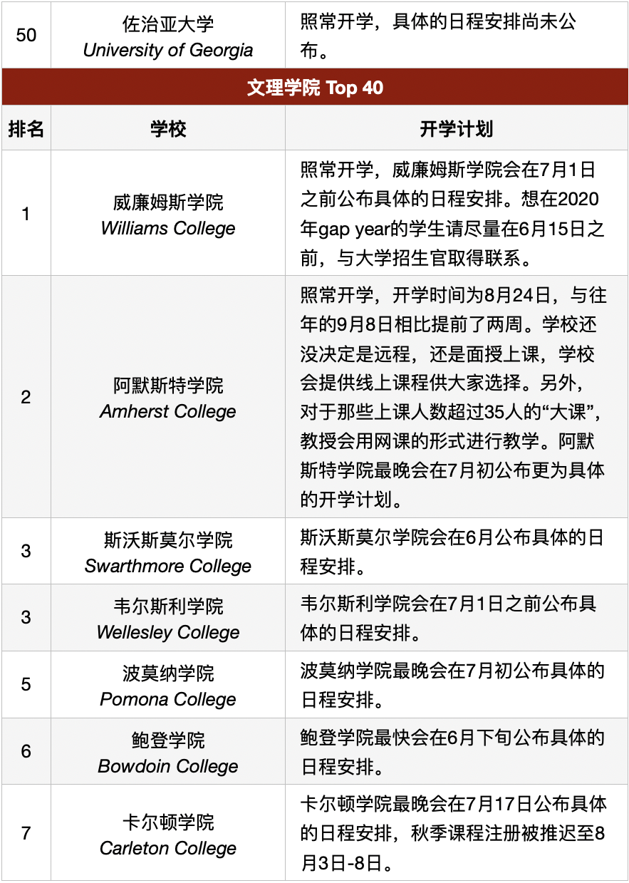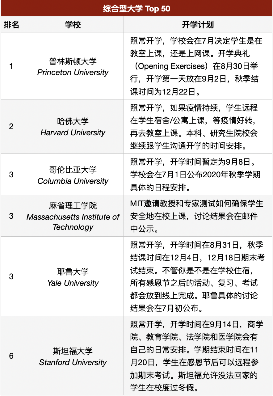 接下来,我们为你总结了90所美国顶尖大学的开学计划,其中包括了U.S.News排名前50名的综合型大学和前40名的文理学院。多数美国大学将在6月中旬到7月初这段时间给出具体的时间安排。