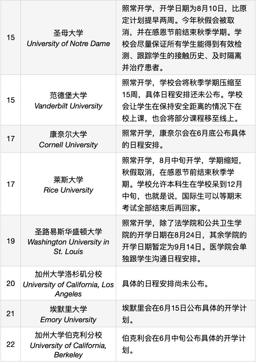 真正让大学重拾信心的,是5月底圣母大学的校长John I. Jenkins在纽约时报写的文章。他给出了具体的解决方案:提前两周开学,缩短秋季学期,取消秋假,并在感恩节放假前结束秋季课程。