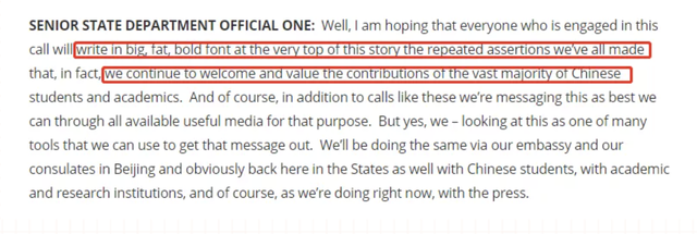 发布会上官员告知媒体:我希望参与此发布会的每个人回去都可以在开头写下大号加粗的字体,事实上,我们继续欢迎并重视绝大多数中国学生和学者的贡献。我们还将通过所有可用的有用媒体尽力传递这一消息。