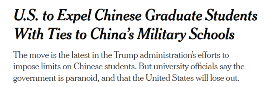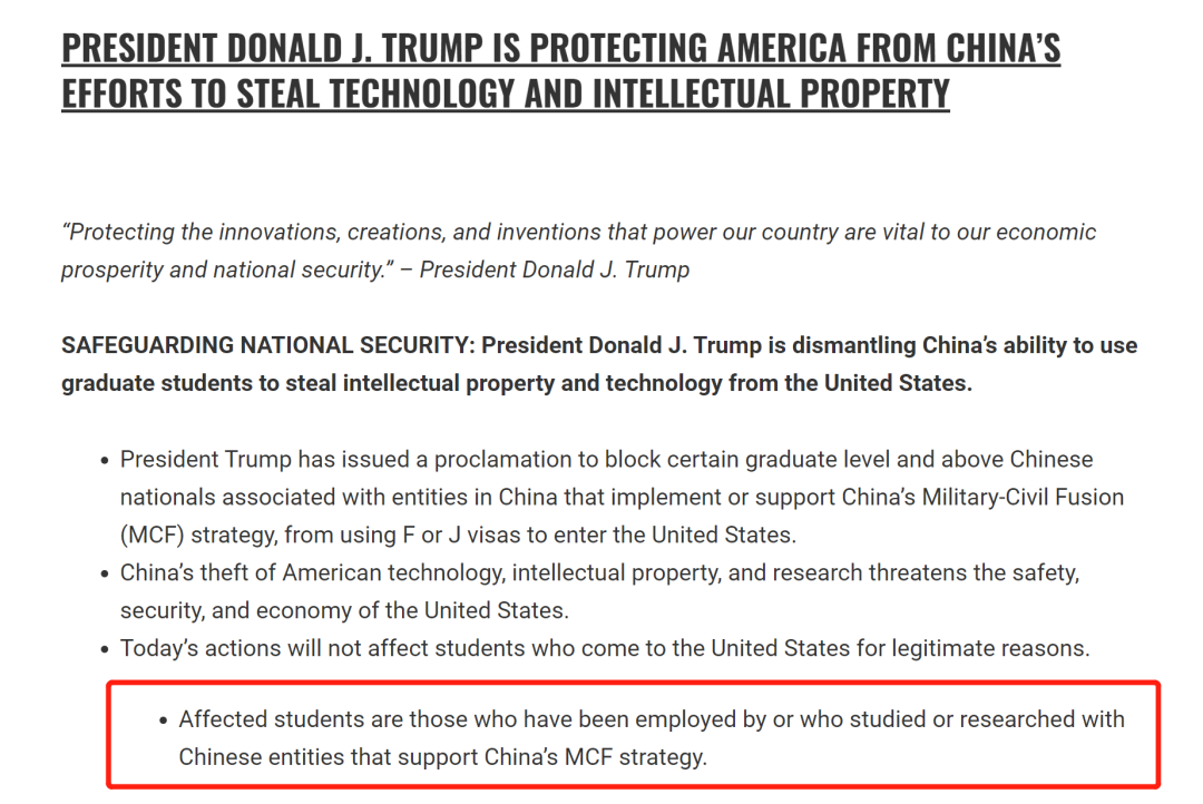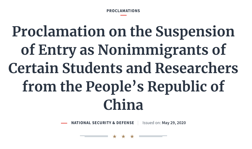 美国白宫政府网站发布了最新的总统公告《关于暂停部分中华人民共和国留学生和研究人员以非移民身份入境的公告》,禁止“与中国军方有关”持F签(学生签证)和J签(访问学者签证)的中国研究生和学者入境美国。