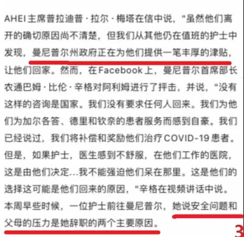 原文称:这些护士大多来自曼尼普尔邦,邦政府为护士们提供了一笔丰厚的津贴,让他们回家。一位护士说,安全问题和父母的压力是她辞职的两个主要原因。