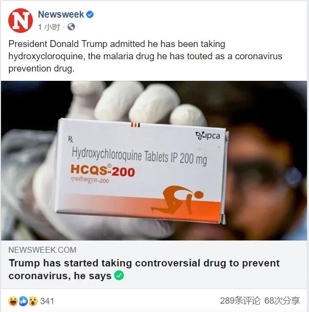 周一,美国总统川普在白宫简报会上说,他已经服用抗疟疾药物羟氯喹一个多星期来预防感染新型冠状病毒。不过,专家说这种药是无效的,而且副作用很大。不过时间刚过去两三天,川普又改口了,说自己决定不吃了。