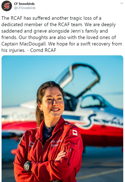 还有一个消息也让人心情沉重,加拿大雪鸟飞行方阵中一位女飞行员在前一天的飞行表演中不幸坠机身亡。