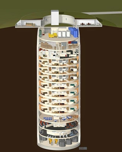 自从十多年前购买了这个发射井,霍尔已经把这个地下巨型建筑改造成了一个15层的倒置塔楼——“地牢”——现在被称为“生存公寓”。它被设计为一个最多可容纳75人的社区,可以在一个密封的、自给自足的豪华栖息地内最多度过5年。当大灾过去后,居民们希望能够在世界末日后的世界中出现,重新重建社会。
