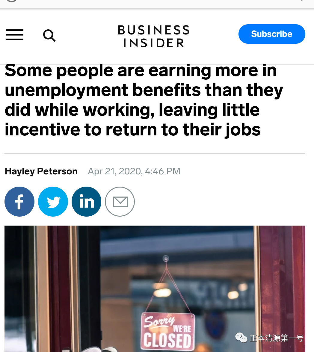 • 纾困金比工资还多。过去5周,美国就有2650万人申报失业,失业率高达11%。为什么失业率这么高?其实是因为纾困金太高了,甚至不少没有完全失业的人,也干脆彻底失业了,因为这样领钱更多。总之政府就是各种发钱助困。政府不断的推出各种纾困基金和资助,对于普通民众,可以说,在家里躺赚了。