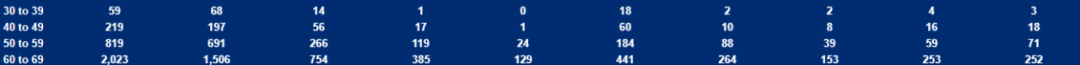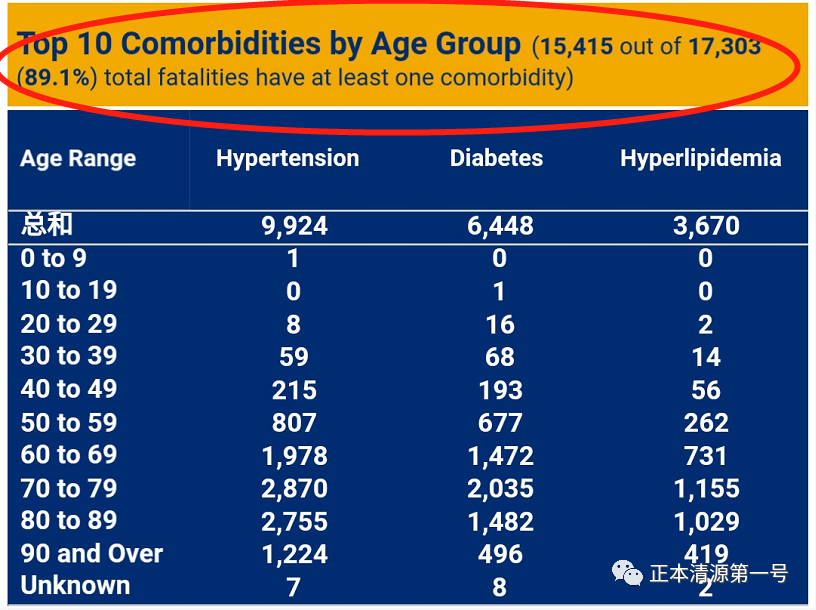可以看到,实际上将近90%的人是因为各种并发症死亡的。表格里死亡人数最多的十种并发症人数、年龄段分布,都列得非常清楚,依次是高血压、糖尿病、高脂血症、冠心病等等。有的老人还不只一种并发症。也就是说,死者绝大多数是本来就有各种基础病并发症的老人,将近一半还是80岁以上的老人。