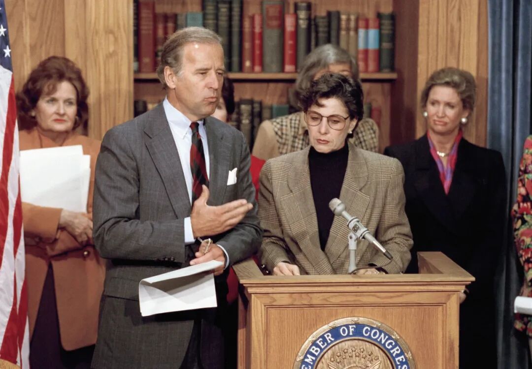 1993年2月,拜登和加州参议员芭芭拉在国会大厦讨论了《反暴力侵害妇女法》。