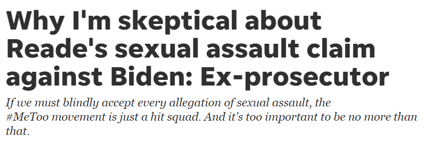 【编者按】《今日美国》昨日刊发了一篇针对拜登性侵案的评论文章,标题为《前检察官:为什么我怀疑雷德对拜登性侵的指控》。作者表示,他支持#MeToo运动,相信“相信女人(性侵受害人)”这一口号的意义所在,但同时认为不应该盲目地接受每一个性侵指控,否则,#MeToo运动就只会沦为一个攻击工具。作者在文章中凭借28年的检察官经验,细致分析了雷德指控值得怀疑的地方。以下为全文翻译: