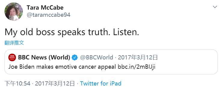 上世纪90年代,拜登曾致力于通过《暴力侵害妇女法案》。2017年,雷德在多个场合转发或 “喜欢 “赞美拜登及其打击性侵的工作。同年,雷德还在推特上转发了其他对拜登的赞美,包括:”我的老上司说的是真话。听好了”(下图)。这很奇怪,雷德会在拜登对她做了她所指控的行为之后还公开赞扬他。