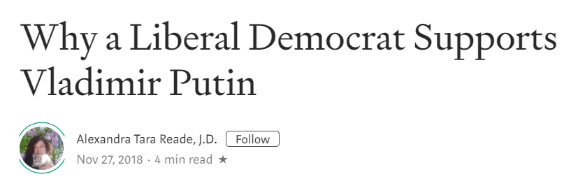 雷德于2018年11月27日在Medium发文,标题为《为什么一个自由派民主党人支持普京》。