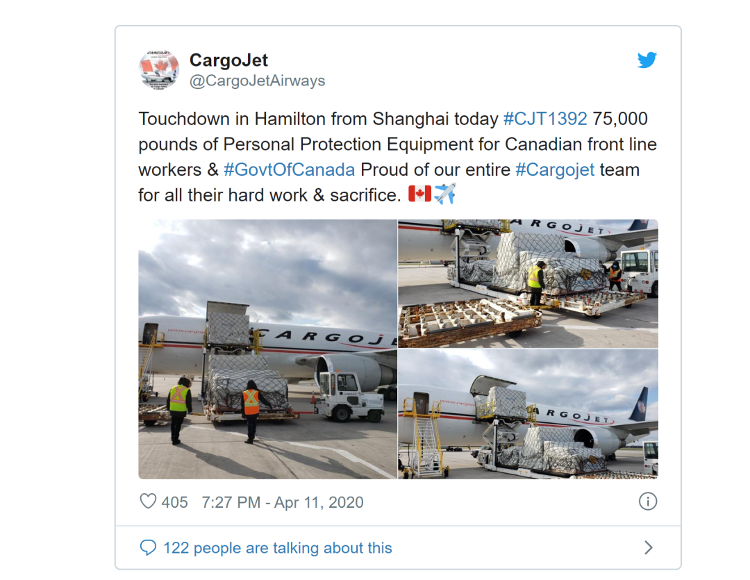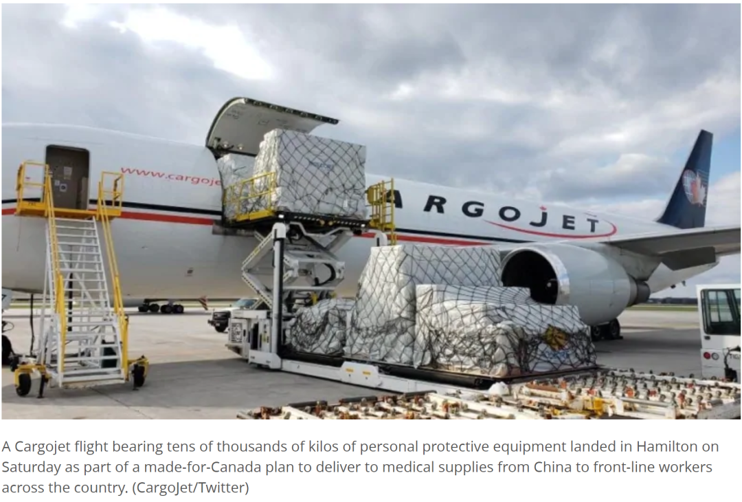 作为努力的一部分,首批组织的两架飞机于4月1日和6日抵达多伦多,运送个人防护装备补给。4月6日的航班抵达时,联邦政府订购了大约800万个医用口罩,新斯科舍省和魁北克省政府也直接订购了其他口罩。