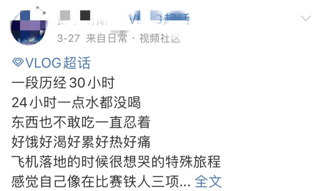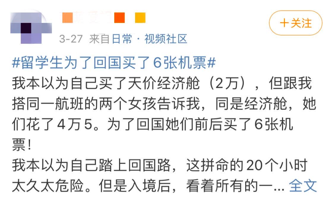 面对这样的情况,一些同学选择迅速回国,他们花费二十多个小时、甚至是30多个小时辗转第三国,为了减少感染的可能,基本上处于不吃不喝的状态。