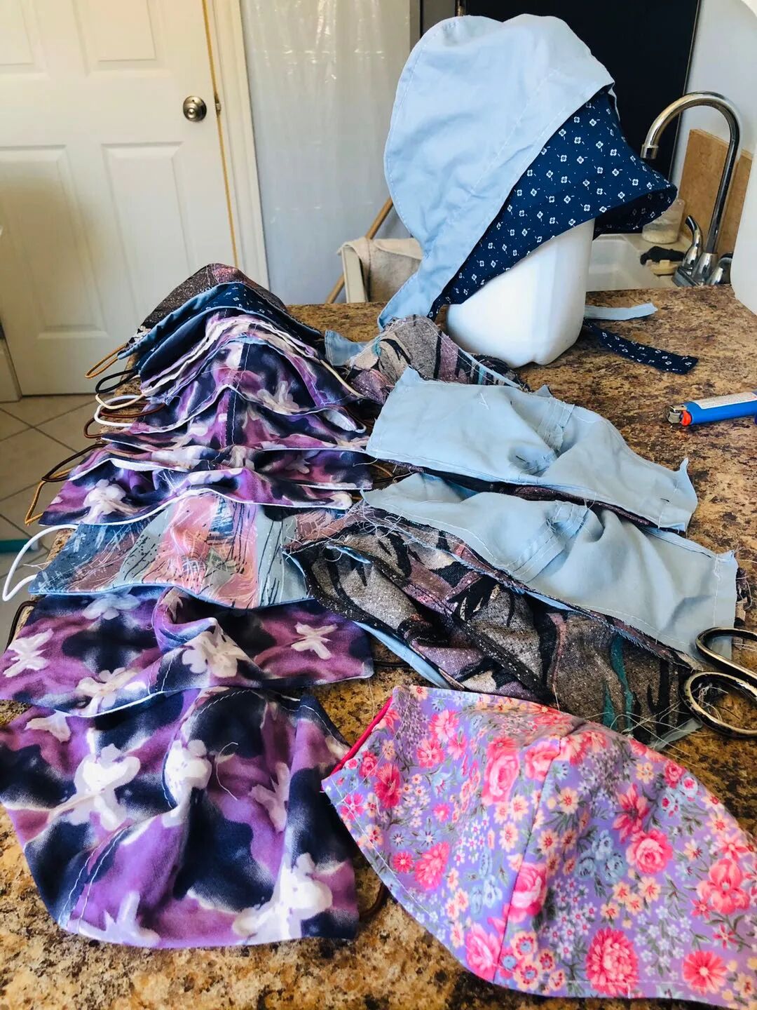 图片里花花绿绿的是本地华人做的帽子和口罩 捐给本地医院的