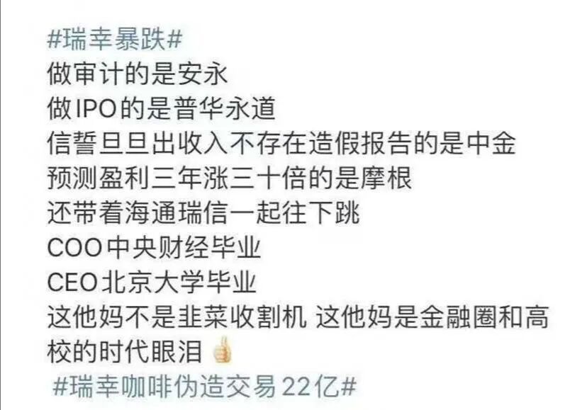 在金融圈要做成一件伟大的事,可能并不需要太深的专业知识,要的只是基本的道德底线和足够强的毅力。瑞幸在创建、上市、审计过程中一路都伴随着名校名企光环,头顶“全球最快IPO公司”的光环,如今爆出这种事情,这是金融圈和名校智慧在反方向上的一次极致演绎。