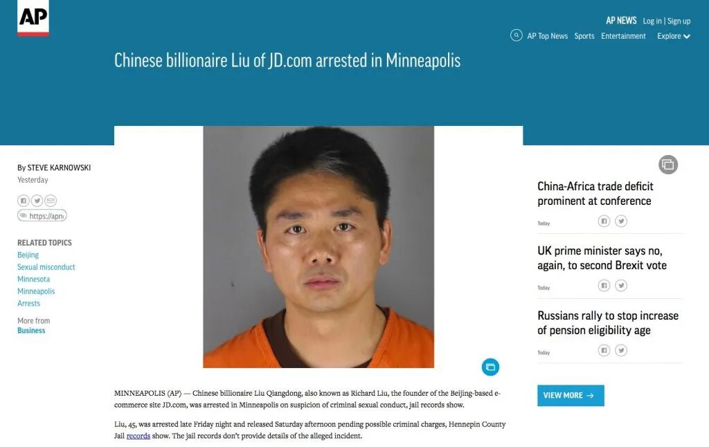 刘强东事件发生后,京东官网辟谣,但辟谣很无力,事情在当时已登上美国新闻