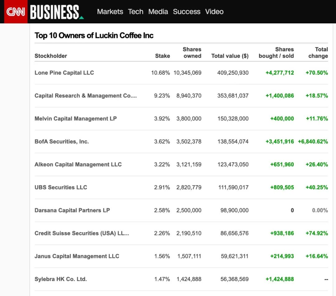 瑞幸咖啡的前十大股东,包括孤松资本、资本研究全球投资者、瑞信、美国银行等知名机构的大名赫赫在列