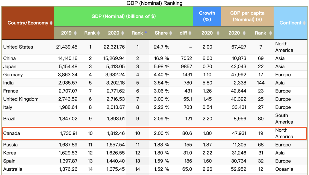 3月初,特鲁多曾介绍称,援助资金方案暂定为820亿加元,约占加拿大GDP总值的3%。直至昨天,这笔资金方案定在了1070亿加元。于是,北北查阅statisticstimes数据得知,人口仅为3759万(2019年)的加拿大,GDP(国民生产总值)每年稳居世界前十之位。