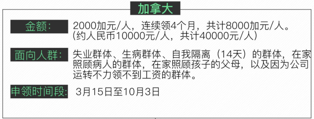 救济金可领4个月,共计8000加元(约4万人民币)。若4个月后,疫情还没有结束,民众则可申请EI,领取失业保险金。