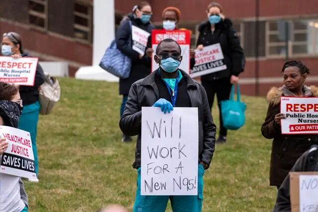 当新冠病毒大流行第一次袭击纽约时,医护人员每次去看望受感染的病人时都要更换长袍和口罩。然后,他们被告知要戴上防护装备,直到换班结束。