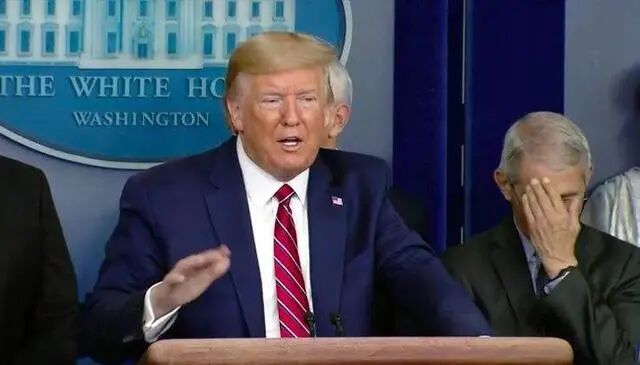 3月20日,在白宫关于冠状病毒的新闻发布会上,特朗普称国务院为“深度国务院”。在他身后,美国国家过敏和传染病研究所所长安东尼·福奇(Anthony Fauci)博士低下头,捂着脸揉了揉额头。