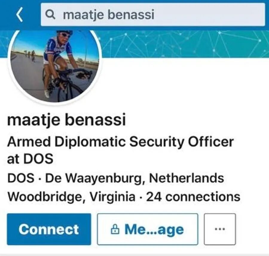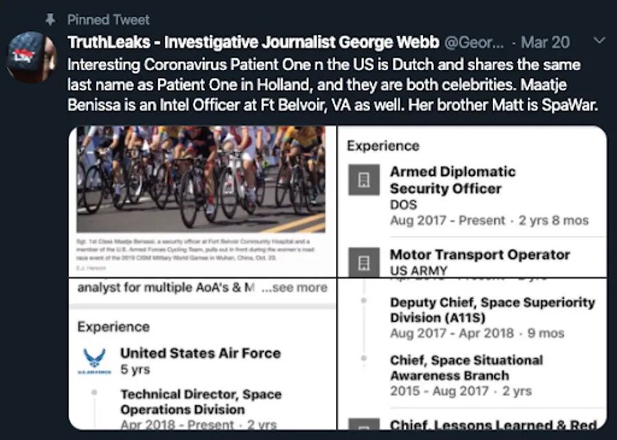我觉得George记者就是搜到Benassi这个姓比较奇怪,所以开始追,因为Maatje虽然去过武汉,但她的履历很清晰(陆军驾驶员,欧洲将军的专车司机,德州驾驶员,华盛顿国务院武装外交安全官),跟病毒或者那个Fort Detrick生物武器基地没有鸟毛联系啊,阴谋论不成立啊。