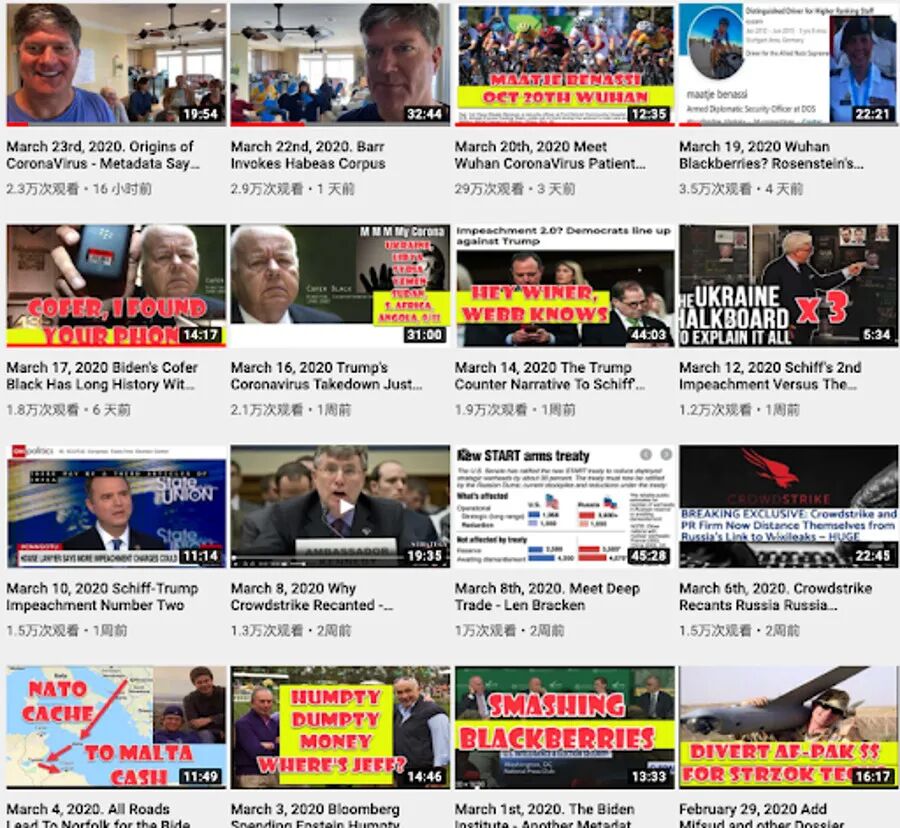 最有意思的是,自从3月19日他开辟了“病毒来源”这个战场后,关注度大增,过去好几年他的视频每个也就1-2万的观看,惨淡经营。20日那个武汉视频的居然已经猛增到30万!还在涨!(就是大家纷纷翻译进来的那个),推特下面也是涌入了大量简体字留言的粉丝,纷纷点赞支持叫好,感谢增援提供猛料,老哥激动的不行!