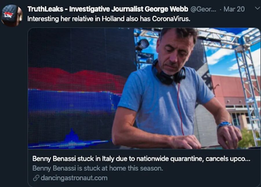 但是,点开大记者George自己推特上这个链接,你会发现,Benny Benassi是个意大利DJ,因为意大利全国“封国”所以被困在家里(新闻上大家早就看见了),不能去北美演出。这可是你自己推特的链接啊,于是: