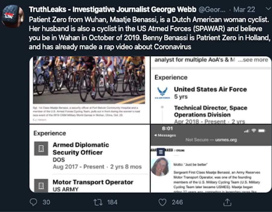 前几天热传一美国“记者”的视频,说查出新冠零号病人是美军女自行车手Maatje Benassi,理由是她去过武汉军运会比赛,她家从军经历与那个美军关闭的生物武器基地有关,而且她家有亲戚确诊了,还是荷兰的首个确诊新冠病人。