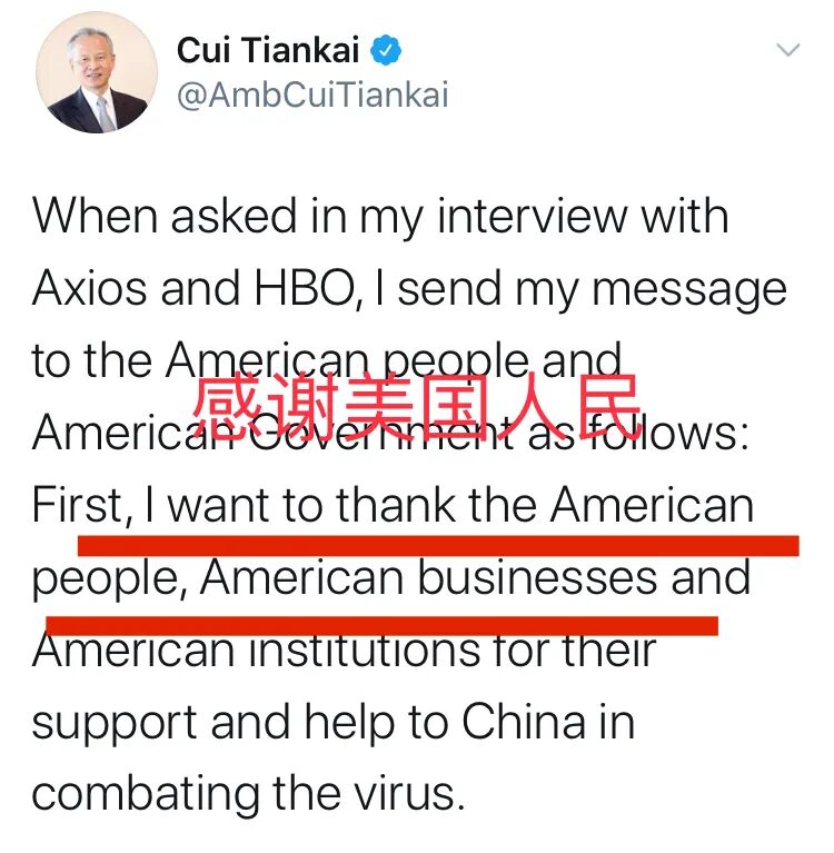 3月23日,崔天凯发推感谢美方支持中方抗疫